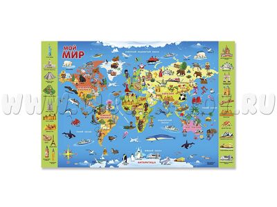 Рекомендована для детей 3-5 лет для знакомства с окружающим миром. Цветная, яркая, ламинированная карта удобного формата (58*38 см) может располагаться с любом месте. Карта двусторонняя: с одной стороны изображены материки и океаны, животные, которые обитают на континентах, а также интересные достопримечательности со всех уголков нашей планеты. С другой стороны – научные факты, представленный в доступной форме инфографики: «Кто быстрее плавает», «Кто быстрее бегает», «Самые высокие горы», «Водные ресурсы», «Океаны Земли» и т.д.