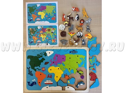Красочная мозаика состоит из 82 деталей. Изготовлена из дерева и окрашена безопасными красками на водной основе. Размеры: 42*29,5*1,5 см. В отличие от классических пазлов, у этой мозаики все детали разных размеров и форм. В комплекте: 2 цветных вкладыша (1 - названия материков и океанов, 2 - места обитания животных, млекопитающих и птиц). Задача ребёнка – собрать карту, а затем населить её животными и птицами, а заодно узнать, кто и где обитает.