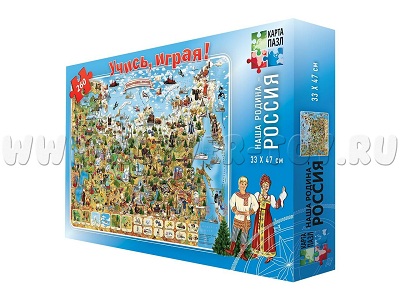 Карта из 260 деталей надолго увлечет вашего юного путешественника, а заодно и поможет узнать и запомнить большой объём информации о нашей стране в игровой форме. Россия - самая большая страна в мире. Здесь обитает огромное разнообразие животных и птиц, множество народов населяют нашу Родину. Россия богата природными ресурсами, такими как золото, уголь, алмазы, газ; развито животноводство и сельское хозяйство. Об этом и многом другом можно узнать, собирая пазлы! Отличный подарок в большой красочной упаковке для детей любого возраста! Размер: 33*47 см.