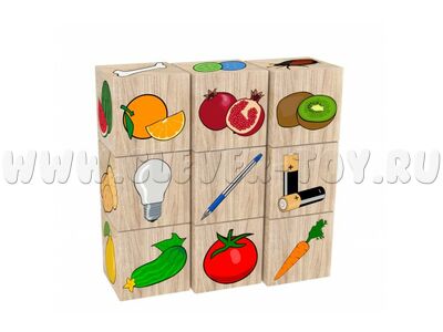 -9 кубиков с изображениями продуктов питания и несъедобными предметами.
