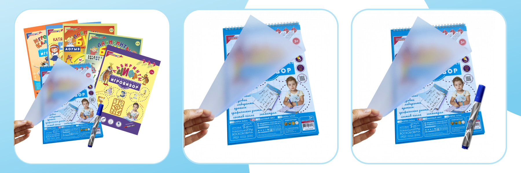 3) Полюбившийся многим графический тренажёр Игровизор (с функцией «пиши-стирай») теперь и с матовым экраном! Всё также на верхнем прозрачном листе любым маркером на водной основе возможно рисовать, обводить, штриховать, соединять.