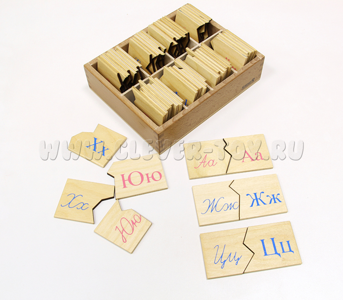В комплект входят деревянная коробка и 66 табличек-пазлов с письменными и печатными буквами.
