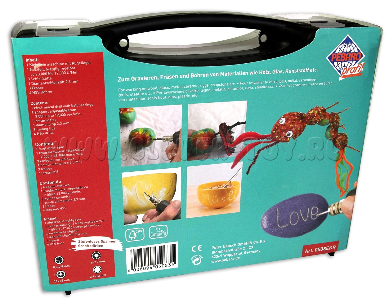 Набор для гравировки немецкой фирмы Pebaro предназначен для работы с деревом, металлом, керамикой, яичной скорлупой, камнем. Весь набор помещен в удобный переносной пластиковый бокс.