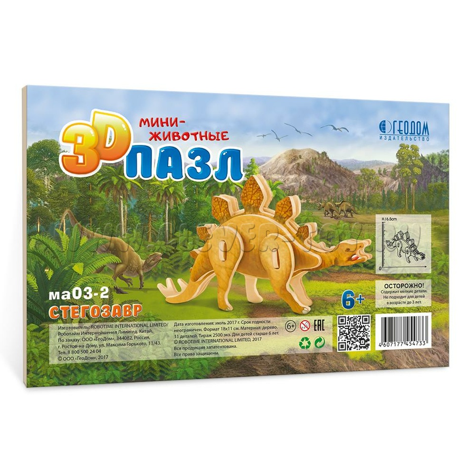 Пазл деревянный 3D. Стегозавр. Серия Мини-животные. Размер 11,5х18,5 см.
