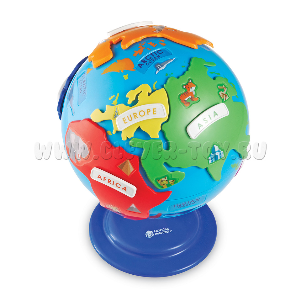 Каждый кусок головоломки (материк) укладывается в свой пазл на земном шаре. Представлены все 7 континентов (Антарктида - встроена).