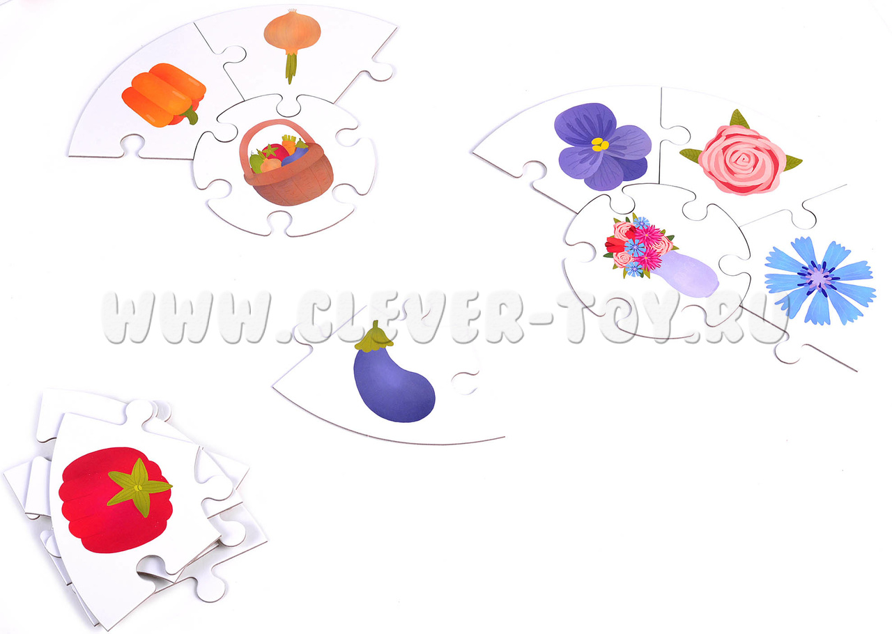 В наборе 6 двухсторонних пазлов по 7 элементов.