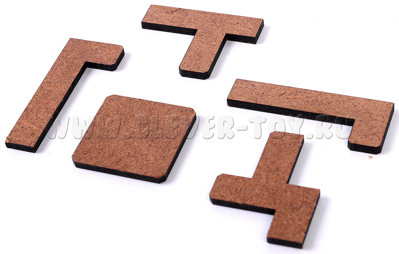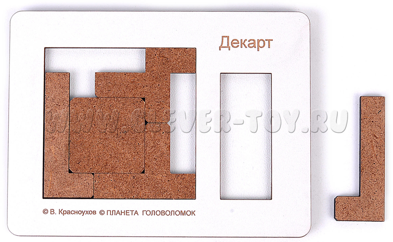 Головоломка "Декарт" состоит из 5 сложных деталей и деревянной рамки. Цель игры - правильно расположить все детали в рамке, чтобы вошли все 5.