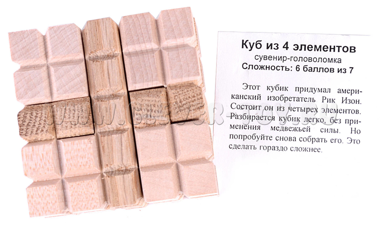 "Кубик из 4 элементов" - это головоломка, которая состоит всего из четырех частей, но имеет высокую сложность. Хотя ее разборка будет простой, собрать ее обратно требует острого ума и настойчивости.