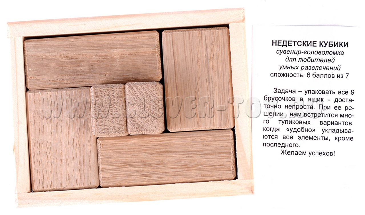 Задача – упаковать все 9 брусочков в ящик - достаточно непроста. При ее решении встретится много тупиковых вариантов, когда укладываются все элементы, кроме последнего.