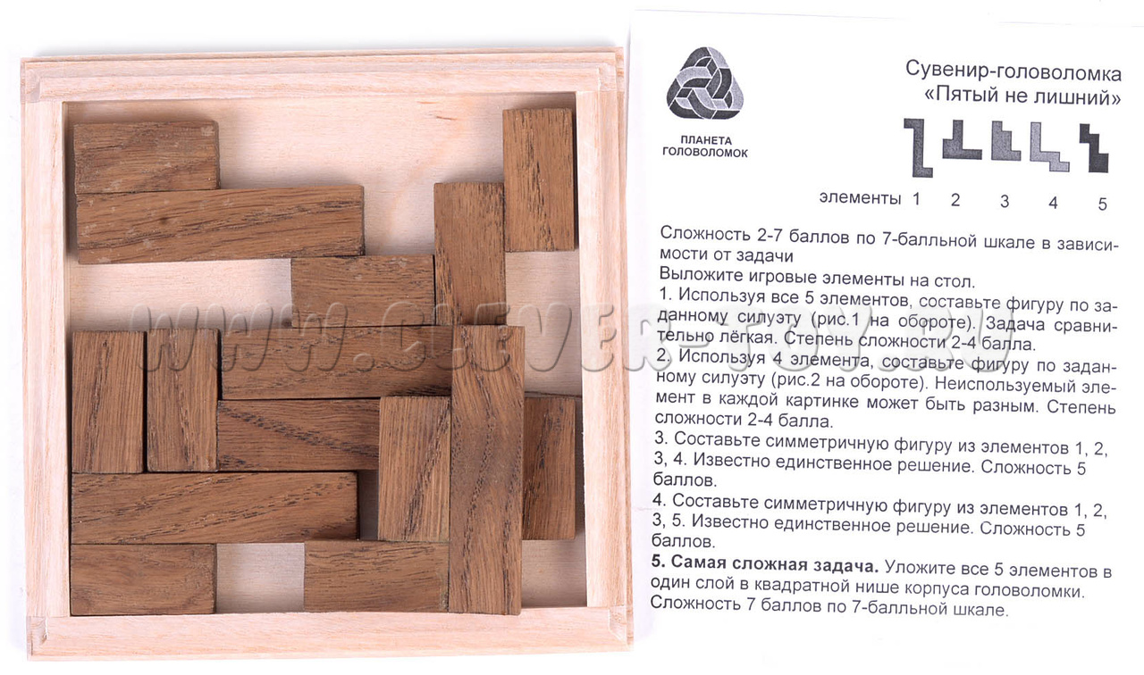 “Пятый не лишний” – головоломка, которая подойдет всем возрастам. Ваша задача - уложить пять элементов в деревянную подложку, таким образом, чтоб детали не выступали за края подноса.