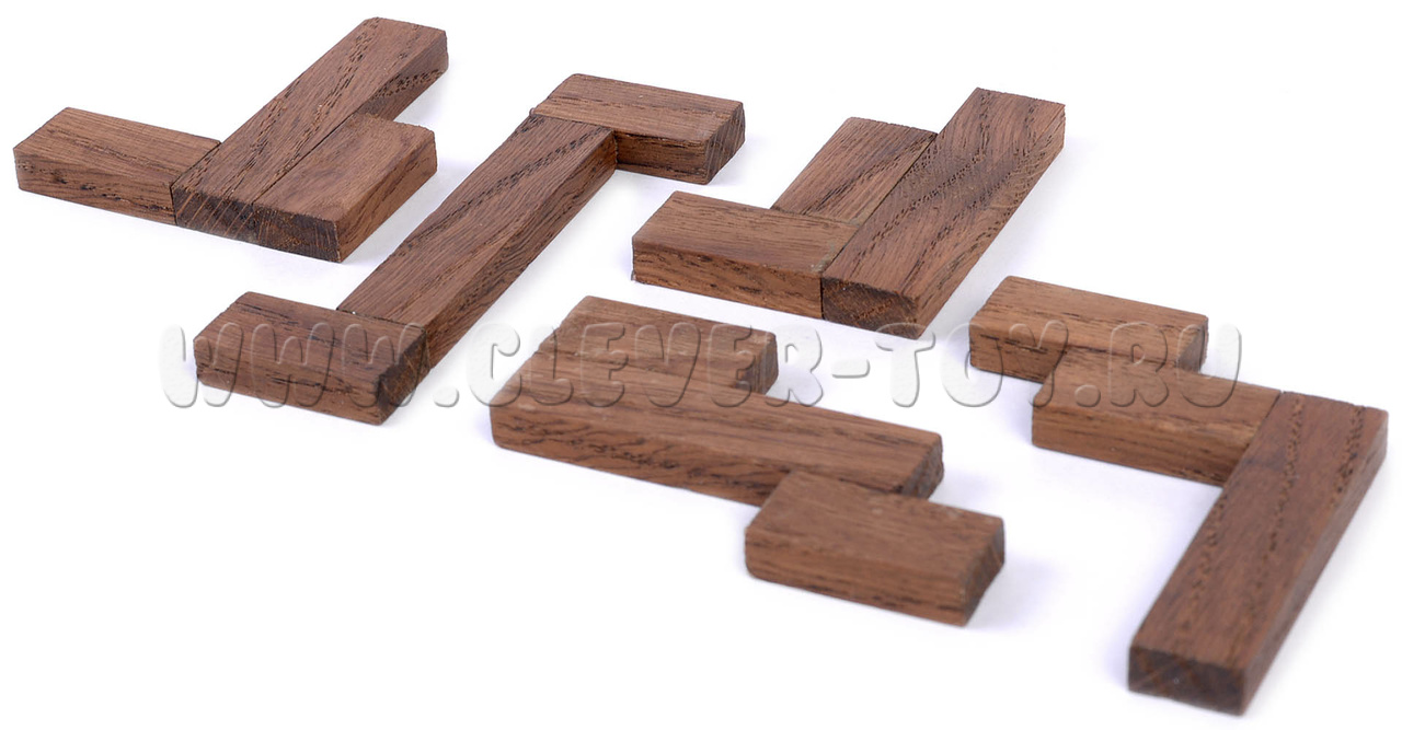 В набор входят пять деревянных элементов и подложка для хранения и выполнения заданий.