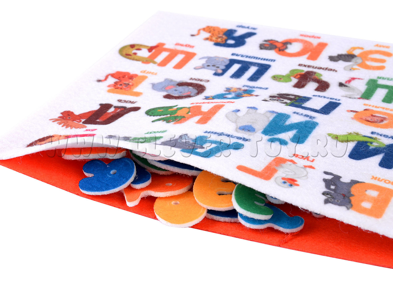 • 33 буквы на липучках синего, голубого, красного, зелёного, жёлтого и оранжевого цветов;