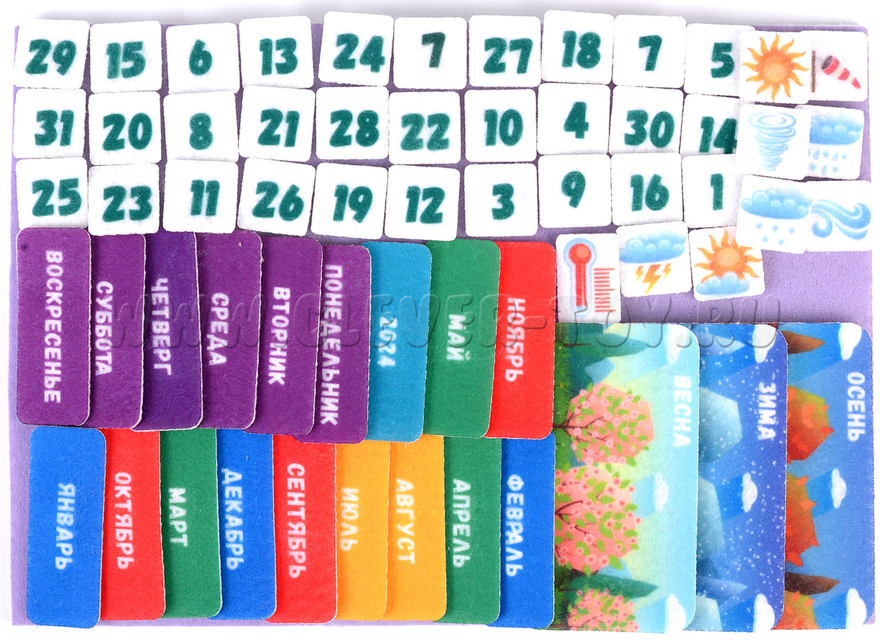 • Таблички, обозначающие времена года (4 шт.), годы (4 шт.), месяца (12 шт.), дни недели (7 шт.), числа (31 шт.), погоду (11 шт.), температуру (2 шт.), время суток (4 шт.).