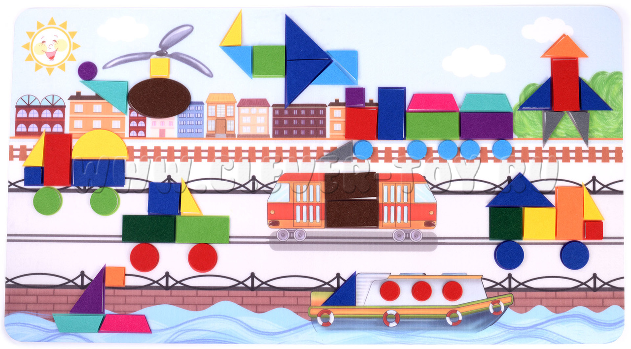Состав набора: основа из фетра 1шт., геометрические фигуры на липучках 61 шт.