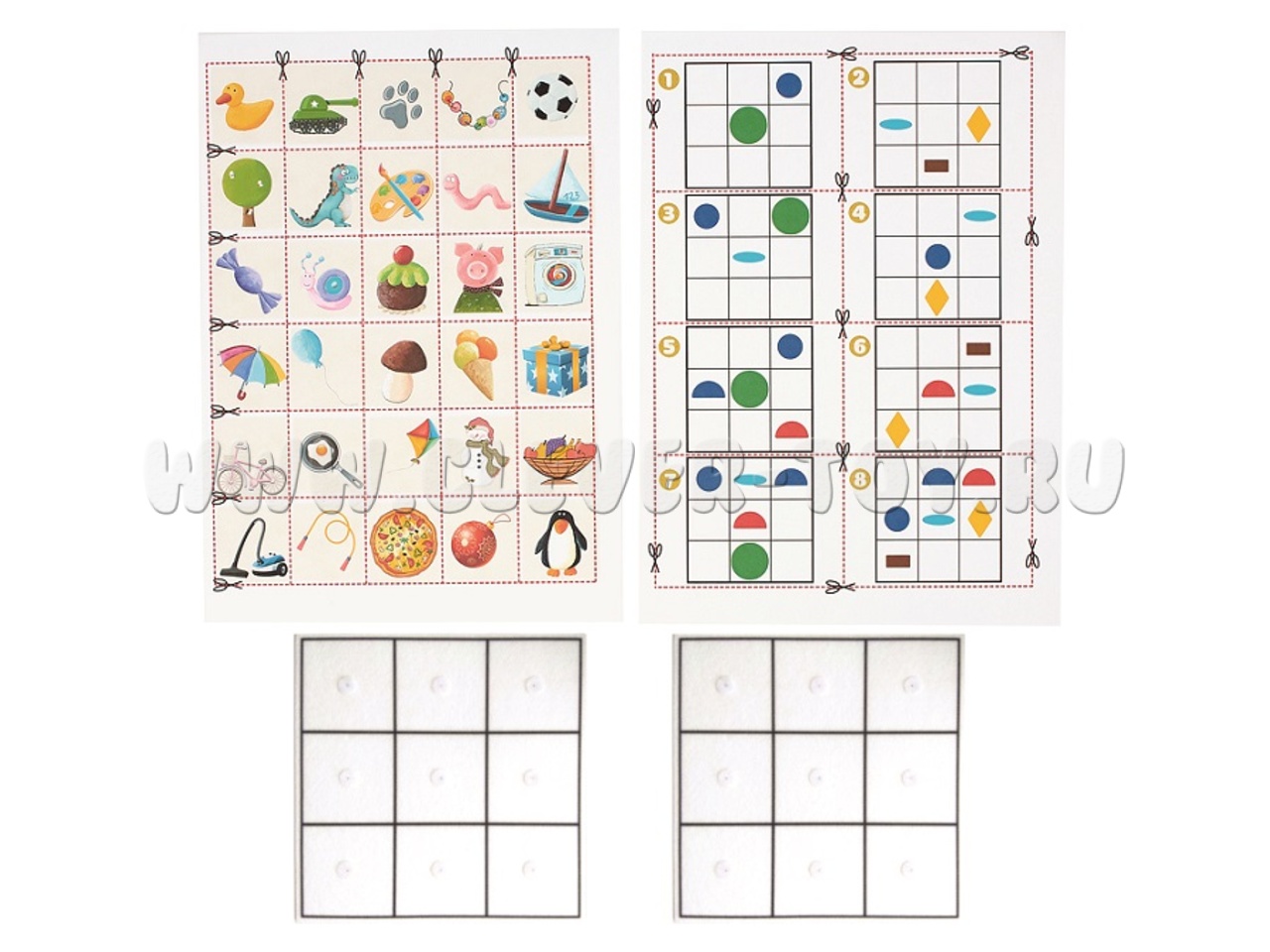 В наборе ковер из фетра (48*84 см), 42 геометрические фигуры на липучках, 2 листа карточек для вырезания, 2 планшета из 9 клеток.
