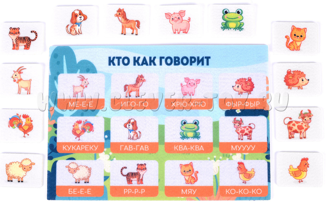 • Прямоугольники с животными: котенка, собачки, петушка, курочки, козочки, лошадки, поросенка, овечки, коровки, лягушки, тигра и ежика (12 шт.).