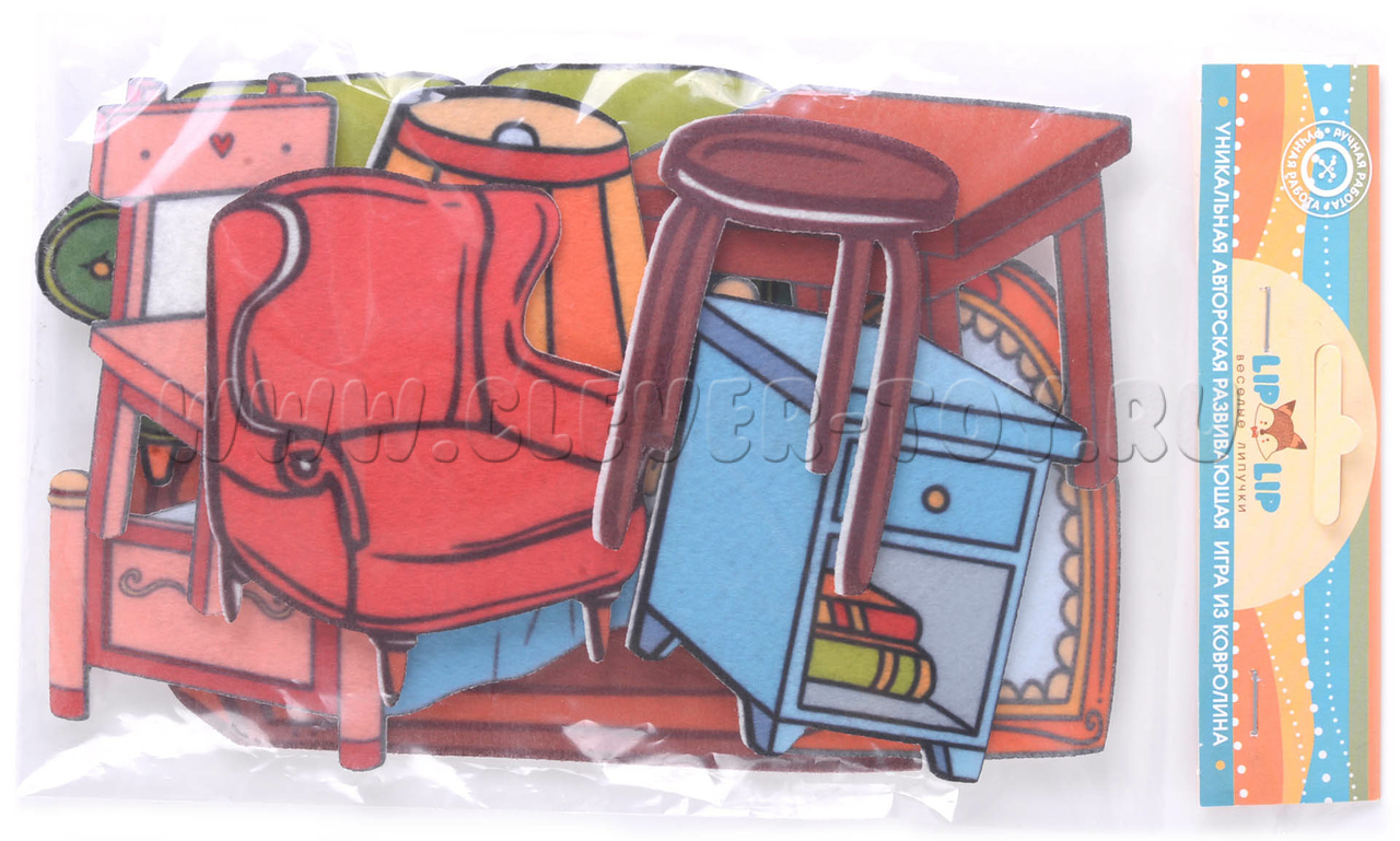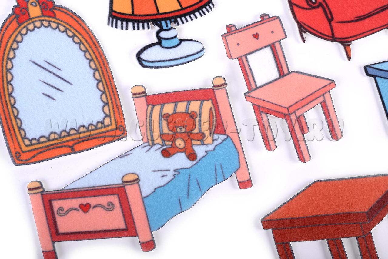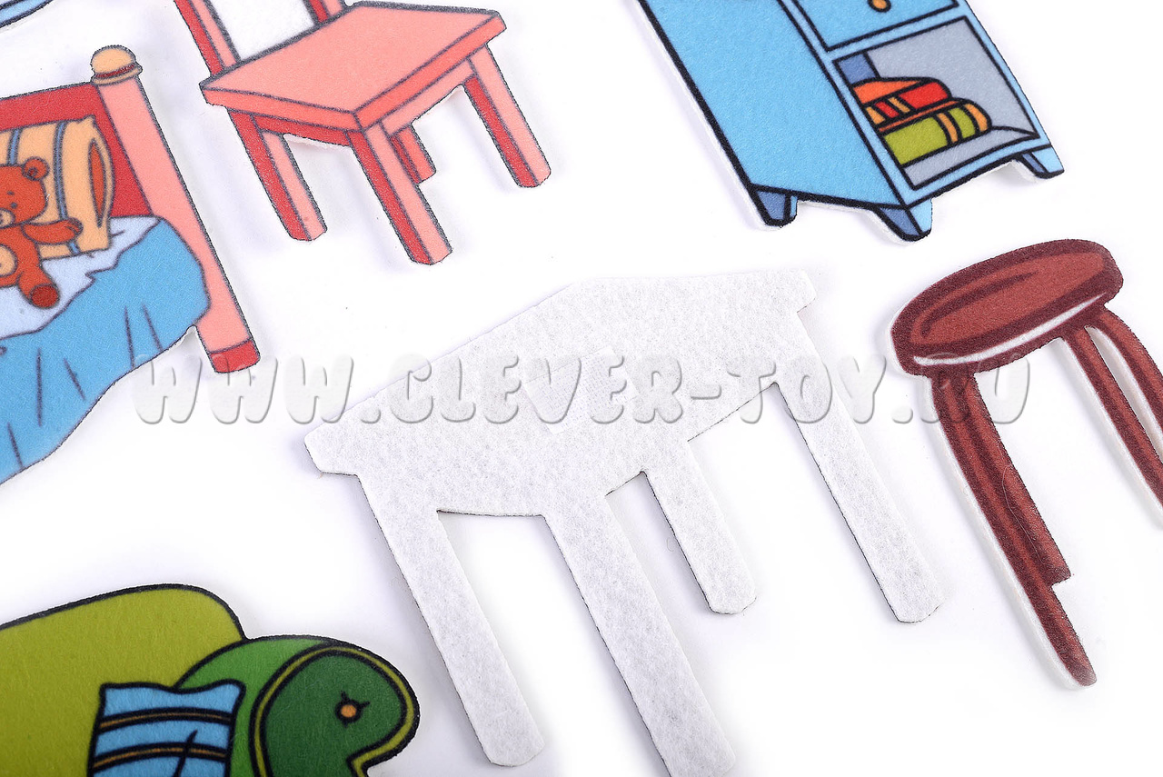 В комплекте вы найдёте 10 фигурок с изображением мебели, которые крепятся на липучках. Размеры фигурок: от 5,5 × 10 см до 9 × 18 см. Материал: фетр.