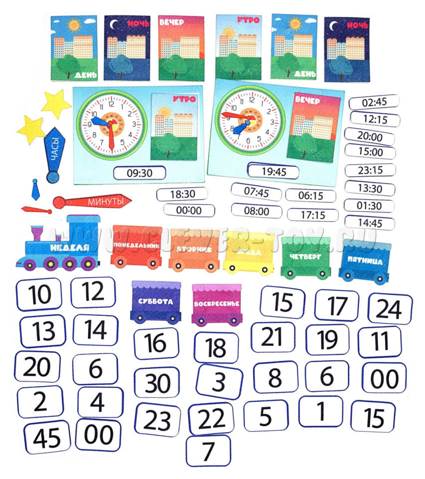 Игра «Часы и время» — это обучающее панно, которое поможет детям познакомиться с понятием времени и научиться ориентироваться во временных рамках.