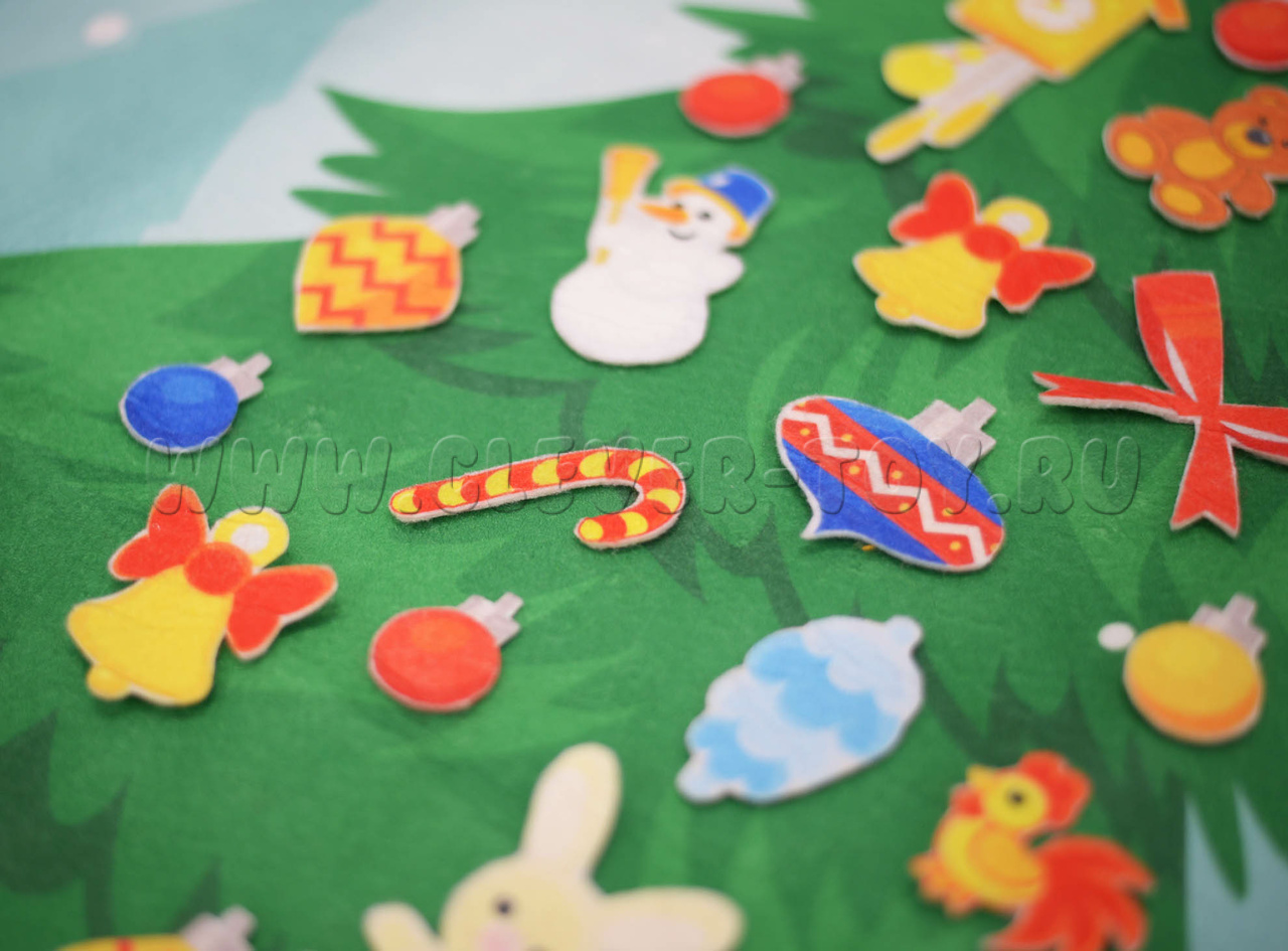 Размер игрового панно: 85*60 см., размер ёлочных игрушек: от 3,5 до 12,5 см.