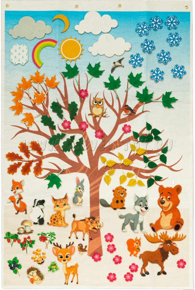 Игра-конструктор «Путешествие по временам года» - незаменимое игровое пособие из современного материала – фетра. На большом панно с изображением дерева могут разместиться забавные животные, лесные жители, ягоды, листики, грибы, снежинки, - количество игр ограничено только вашей фантазией!