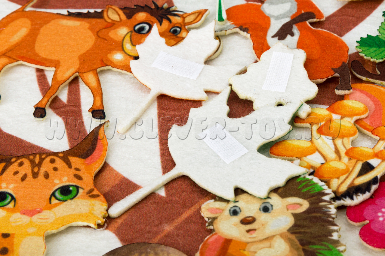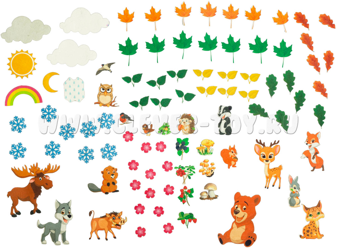 • разнообразные игровые элементы 4-х сезонов – 38 листочков клёна, берёза и дуба, зелёные, жёлтые и красные; 13 цветочков; ягоды малины, земляники, брусники, черники; грибы белые, опята, лисички; 9 снежинок, 3 облачка, радуга, солнце, месяц, дождик; 17 фигурок лесных зверей и птиц - лось, лиса, кабан, олень, медведь, енот, ёжик, сова, снегирь, ласточка, воробей, лягушка, белочка, зайчик, рысь, волк, бобёр.