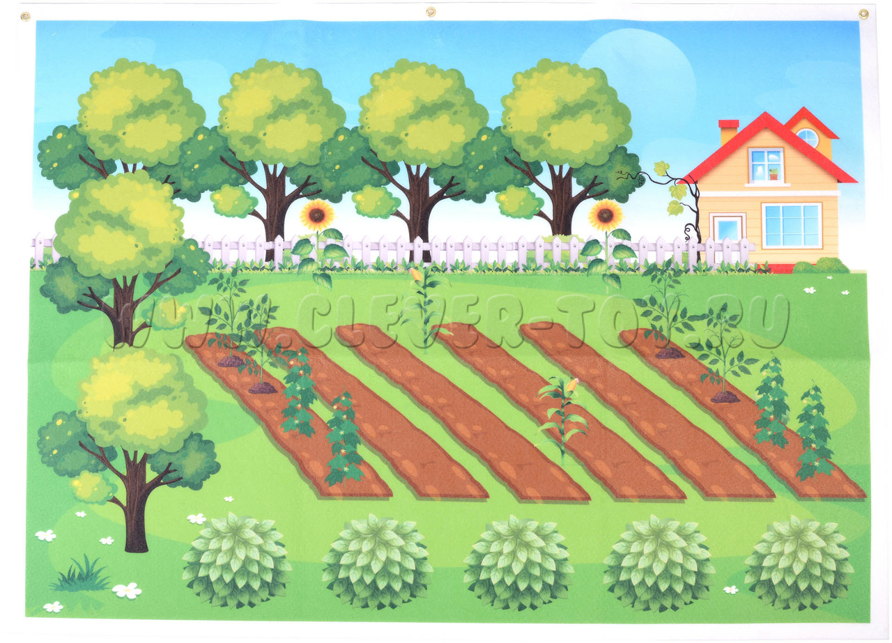 В комплект игры входит игровое поле размером 60x80 сантиметров с изображением домика, деревьев, кустов и грядок. Также в набор входят различные элементы с изображением фруктов, ягод и овощей.