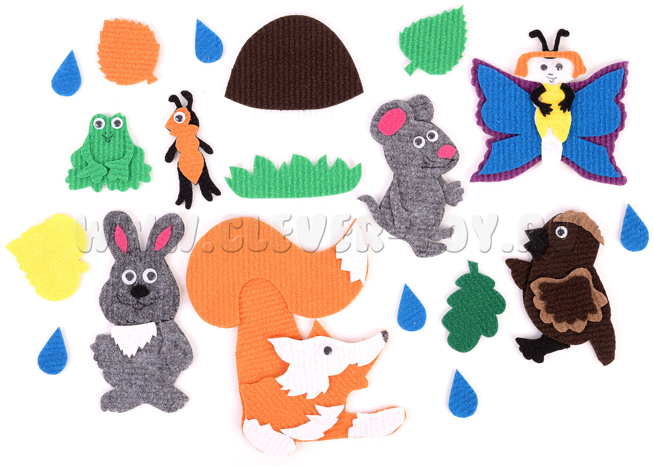 • персонажи сказки: бабочка, воробей, заяц, лиса, мышка, муравей, лягушка;
