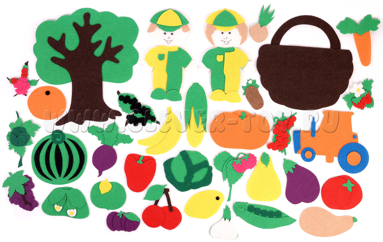 - герои – мальчик и девочка (каждый по 25*15 см); предметы – трактор (20*15 см), дерево (30*30 см), корзина (26*26 см);