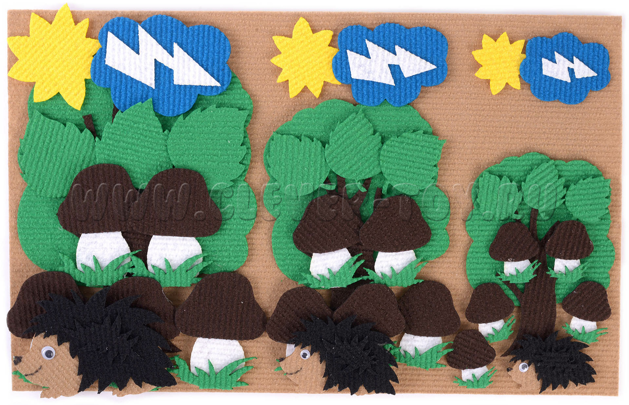 - дерево, солнышко, тучка с молнией, корзинка, ёжик маленького, среднего и большого размера (по три шт. каждого вида);
