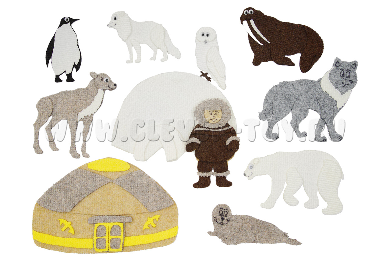 • белый медведь, волк, песец, пингвин, северный олень, тюлень, морж, полярная сова;