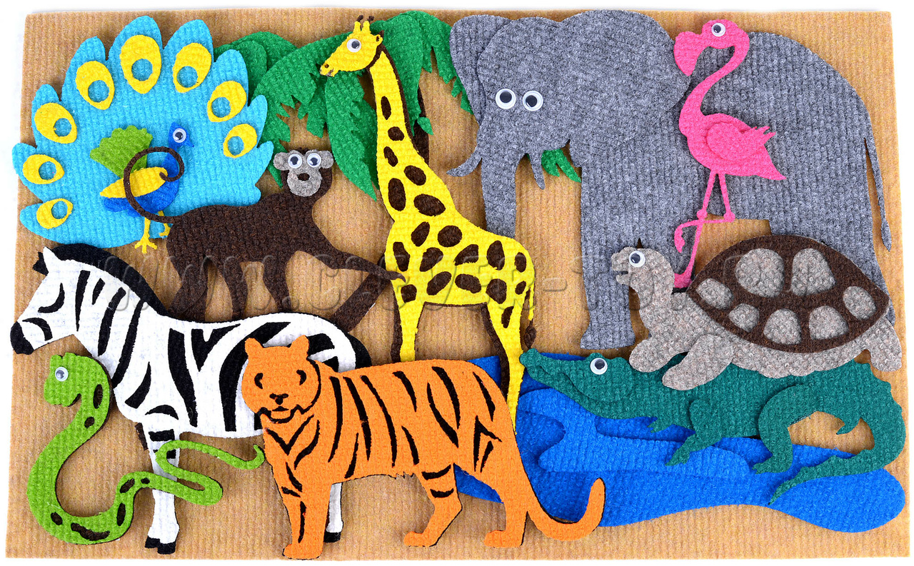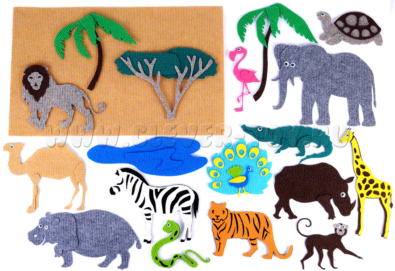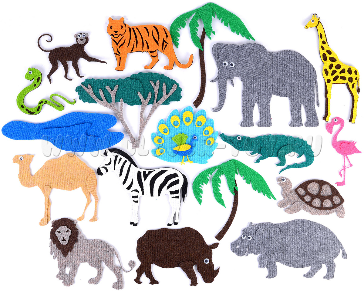 • Животные – зебра, лев, тигр, слон, жираф, обезьяна, павлин, крокодил, змея, черепаха, бегемот, носорог, фламинго, попугай.