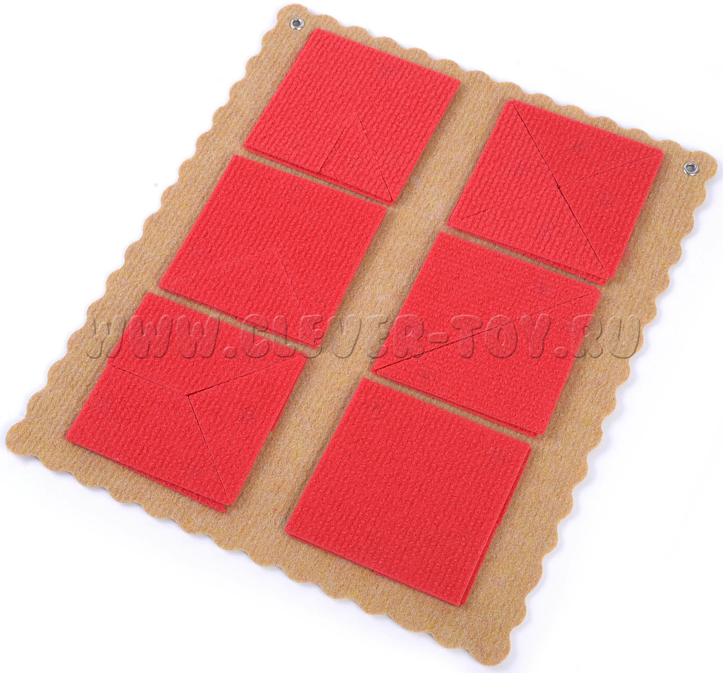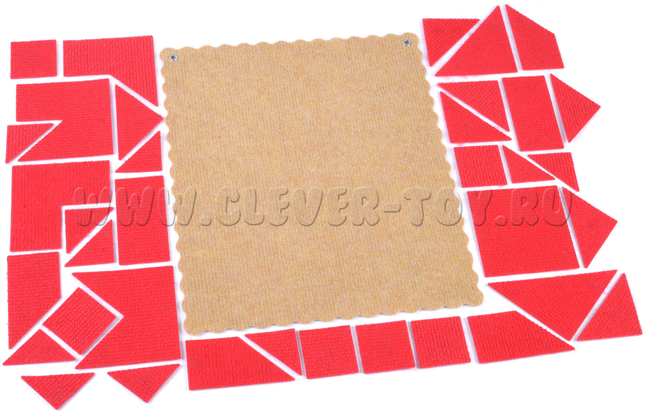 • 36 элементов из ковролина (многоугольник 1 – 1 шт., многоугольник 2 – 1 шт., многоугольник 3 – 1 шт., многоугольник 4 – 1 шт., треугольник маленький – 10 шт., треугольник средний – 7 шт., треугольник большой – 2 шт., квадрат большой – 1 шт., прямоугольник – 2 шт., трапеция 1 - 3 шт., трапеция 2 – 1 шт., квадрат маленький – 6 шт.;