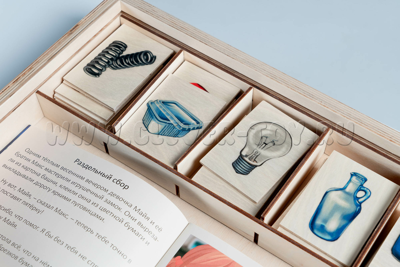 - Дидактическая игра по сортировке мусора (Комплект контейнеров для сортировки карточек с изображением типов мусора, карточки с изображением мусора – 60 шт.);