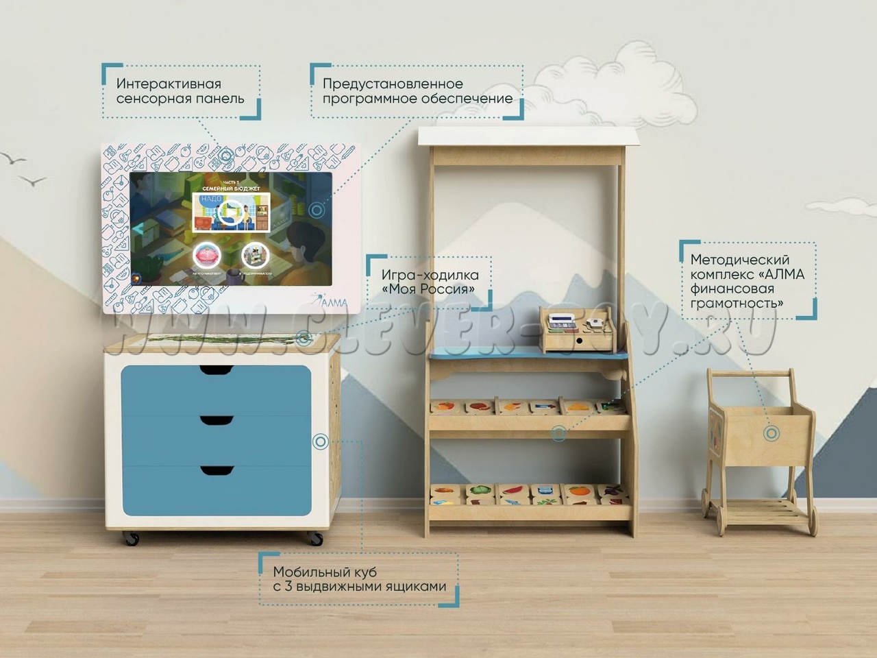 Интерактивный комплекс для детских садов и дошкольных учреждений, который в игровой форме знакомит детей со знаниями в таких сферах, как: финансовая грамотность, экология, ПДД, космос и общие дошкольные знания. Развивает логическое мышление, воображение, концентрацию внимания и память.