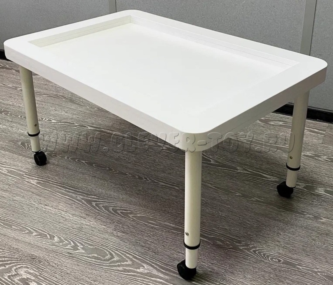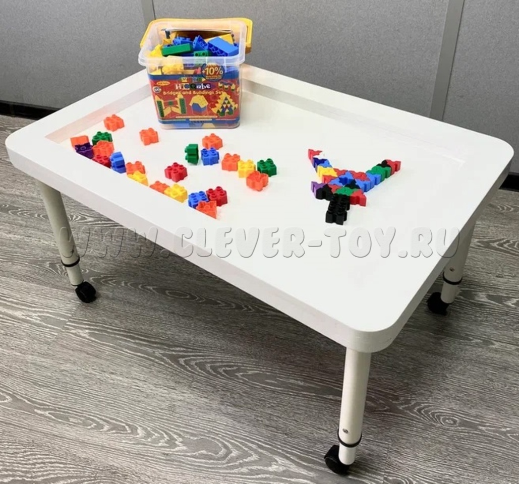 Столик компактен, не занимает много места, оснащен колесиками, с помощью которых его легко перемещать по игровой комнате.