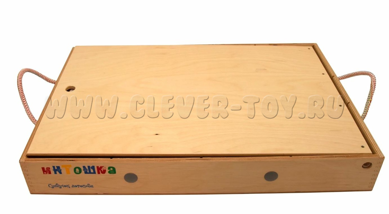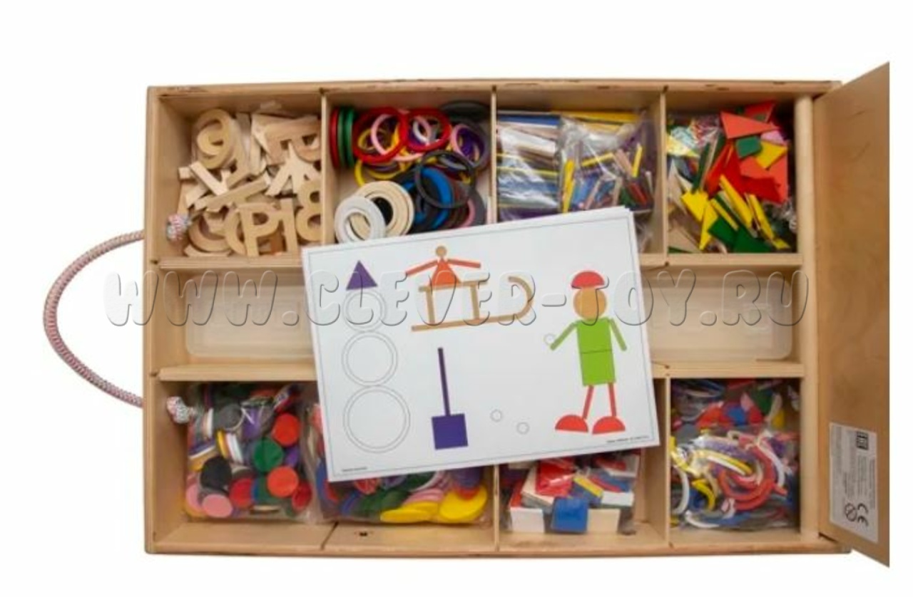 Включает в себя комплект деревянных букв русского алфавита и разноцветные геометрические фигуры в количестве, необходимом для выполнения мозаичных картинок по лексическим темам.