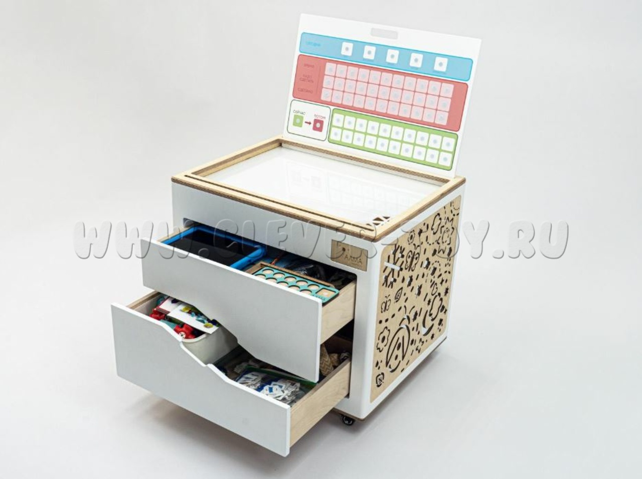 Мобильный куб с выкатными ящиками плавного хода, функциональными боковинами и верхней крышкой. Его можно передвигать в любое место, где ребёнку будет удобно заниматься.