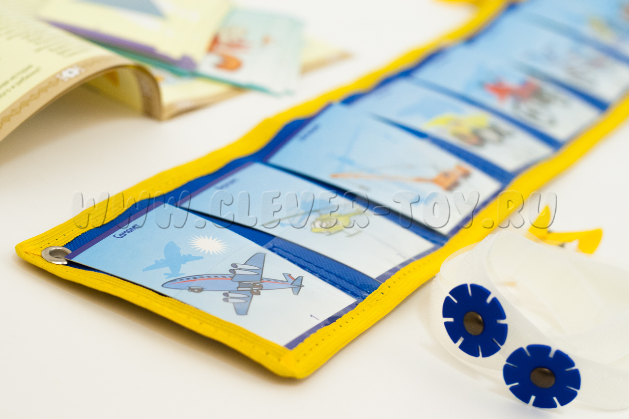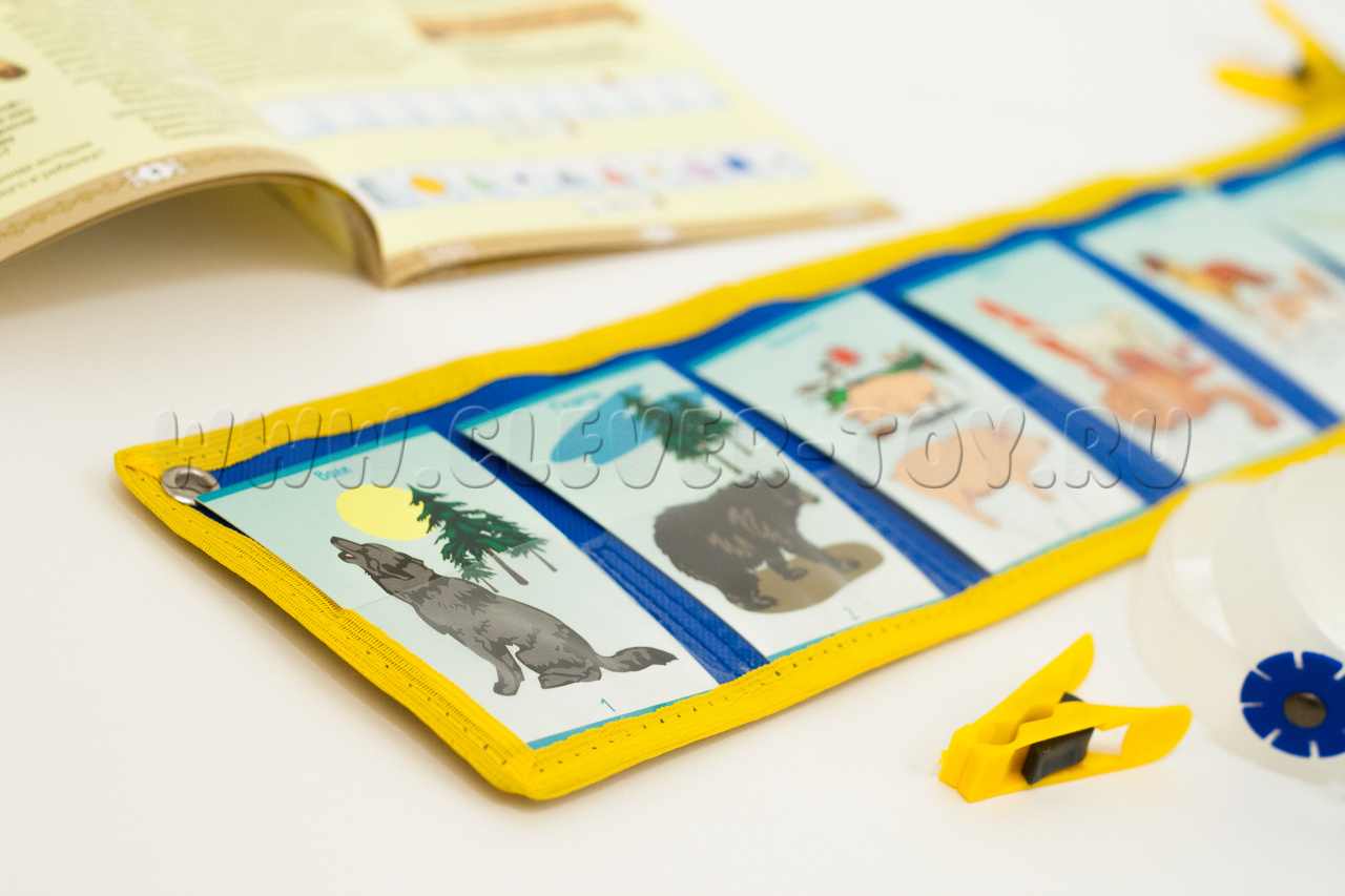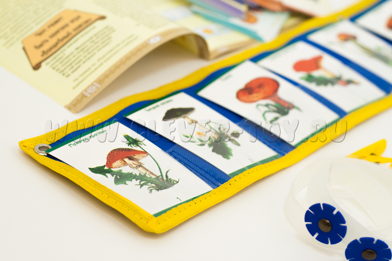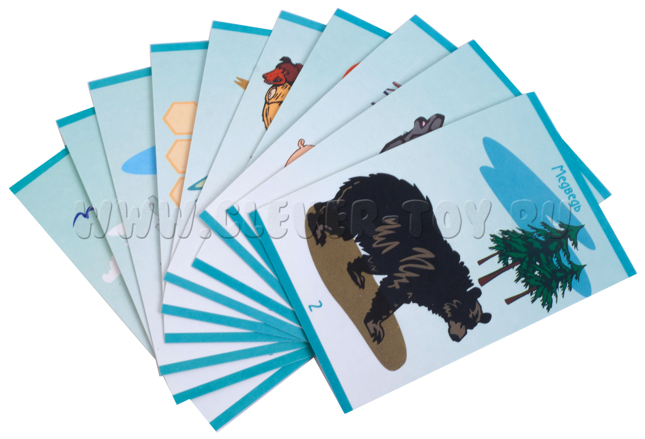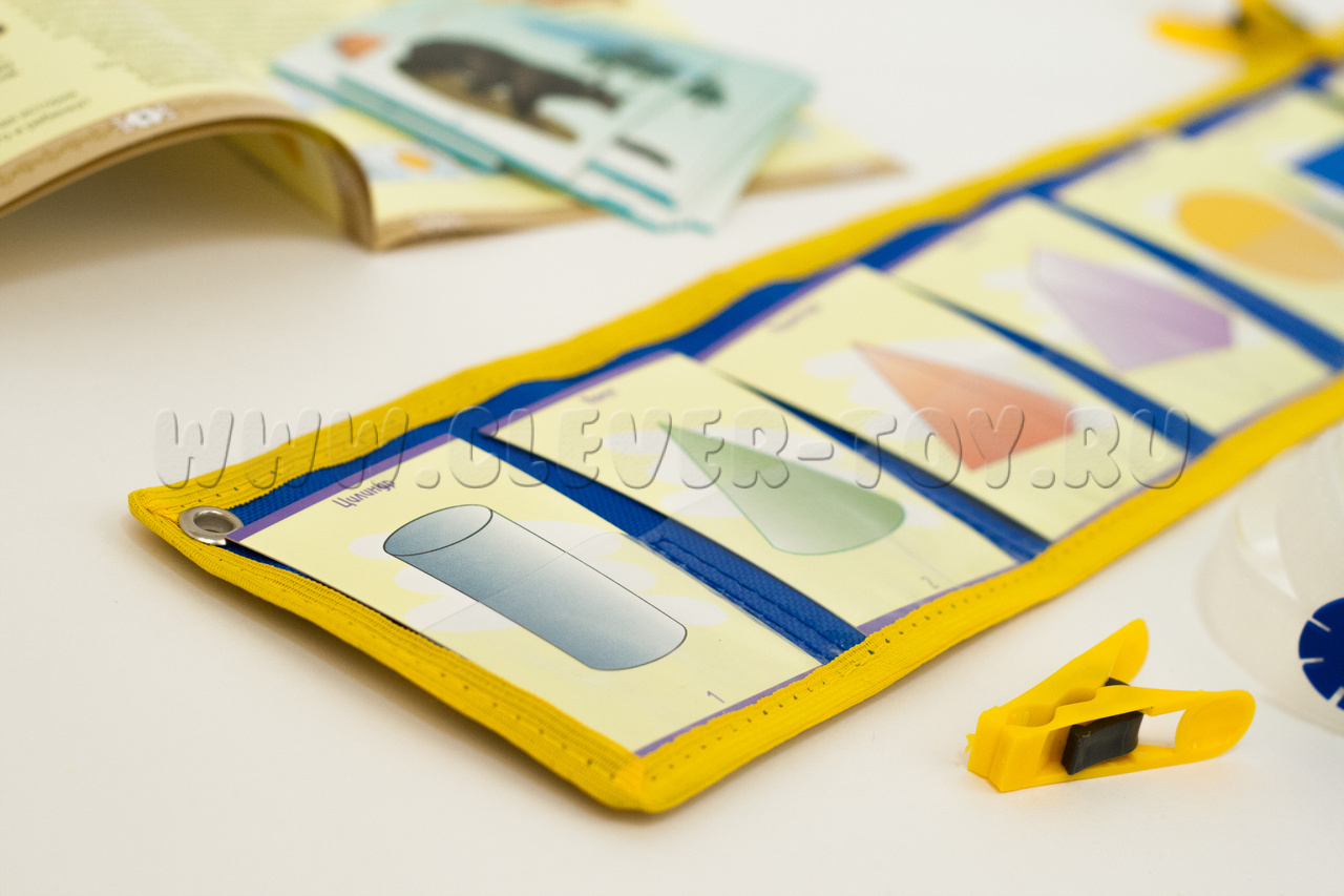 • 5 комплектов тематических картинок – «Геометрические фигуры», «Часы», «Грибы», «Транспорт», «Животные» - всего 50 карточек;
