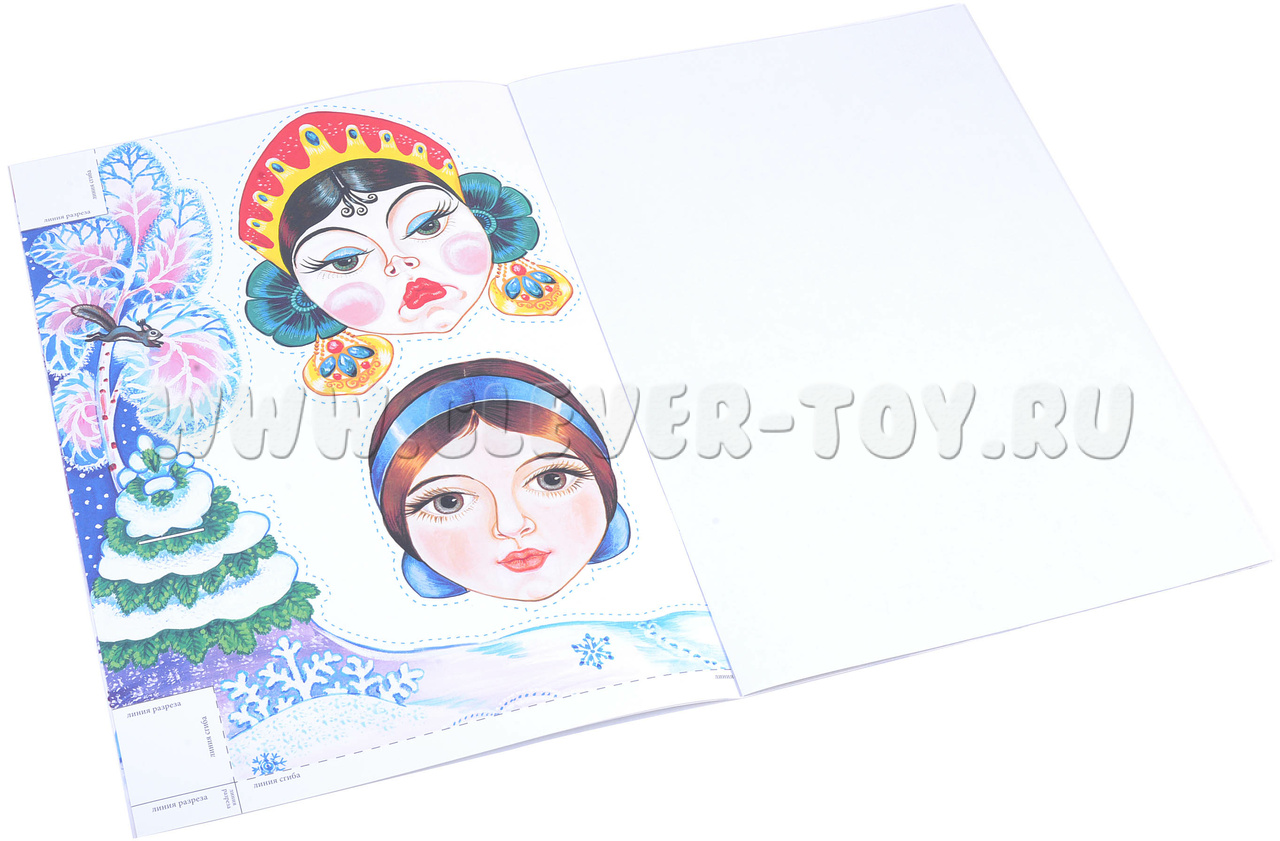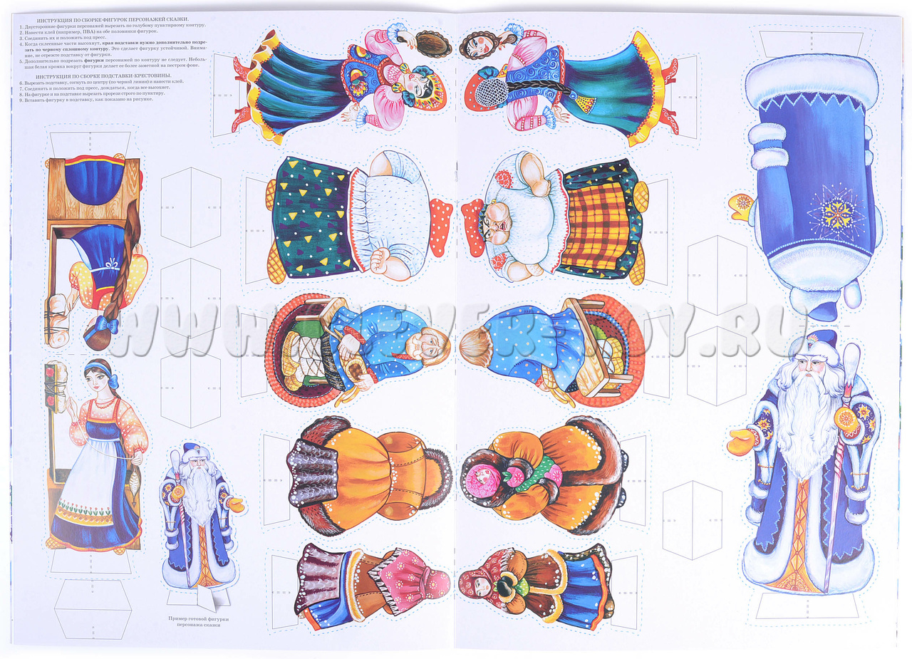 • Фигурки-персонажи которые изготовлены из плотного картона всего 7 фигурок (старухина дочь(2), морозко, старуха, старикова дочь(2), старик). Ребенок должен вырезать данные фигурки по пунктирным линиям, согнуть пополам и склеить клеем;