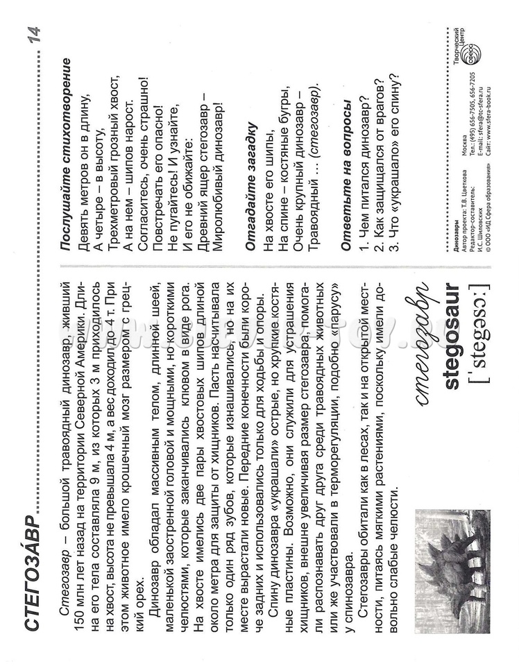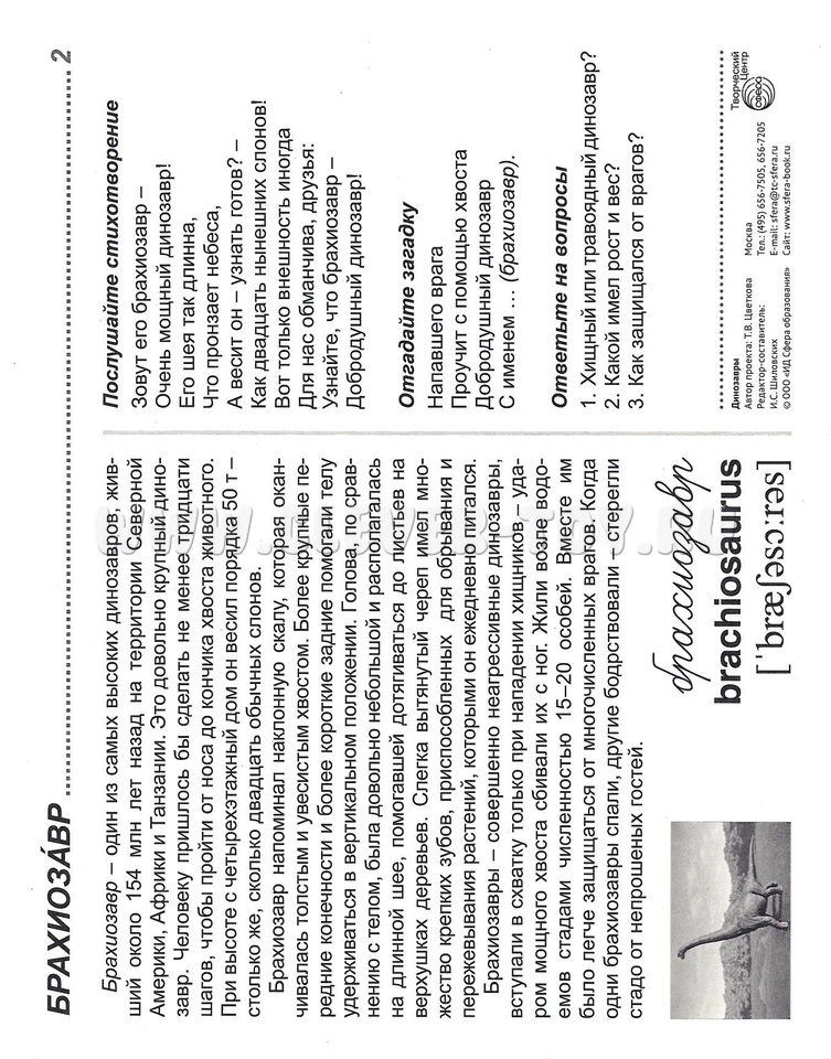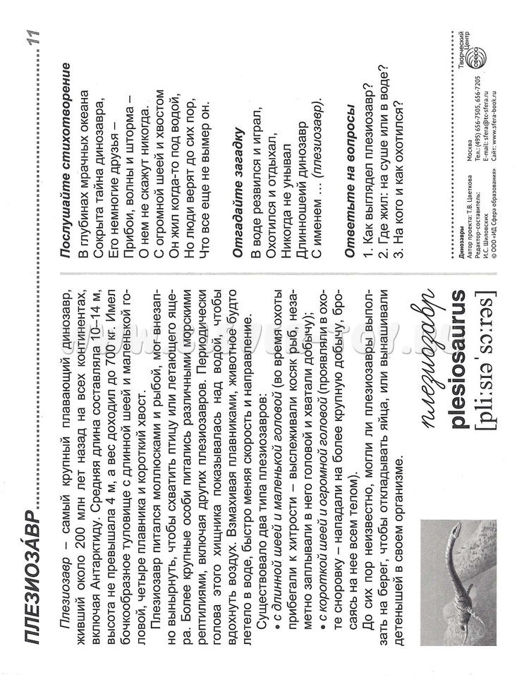 На лицевой стороне каждой карточки дается цветное изображение динозавра, на обратной - подробное описание, из которого дети узнают немало важных фактов о жизнедеятельности доисторических животных. Для лучшего закрепления материала представлены оригинальные стихотворения и рифмованные загадки по теме, а также вопросы, на которые ребенок ответит после изучения материала или беседы со взрослым.