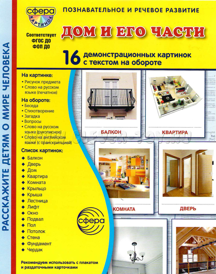 16 демонстрационных картинок для познавательного и речевого развития. На обороте каждой предметной картинки - описание дома и его частей, стихотворение, загадка, вопросы для ребёнка, название животного на русском и английском языках.