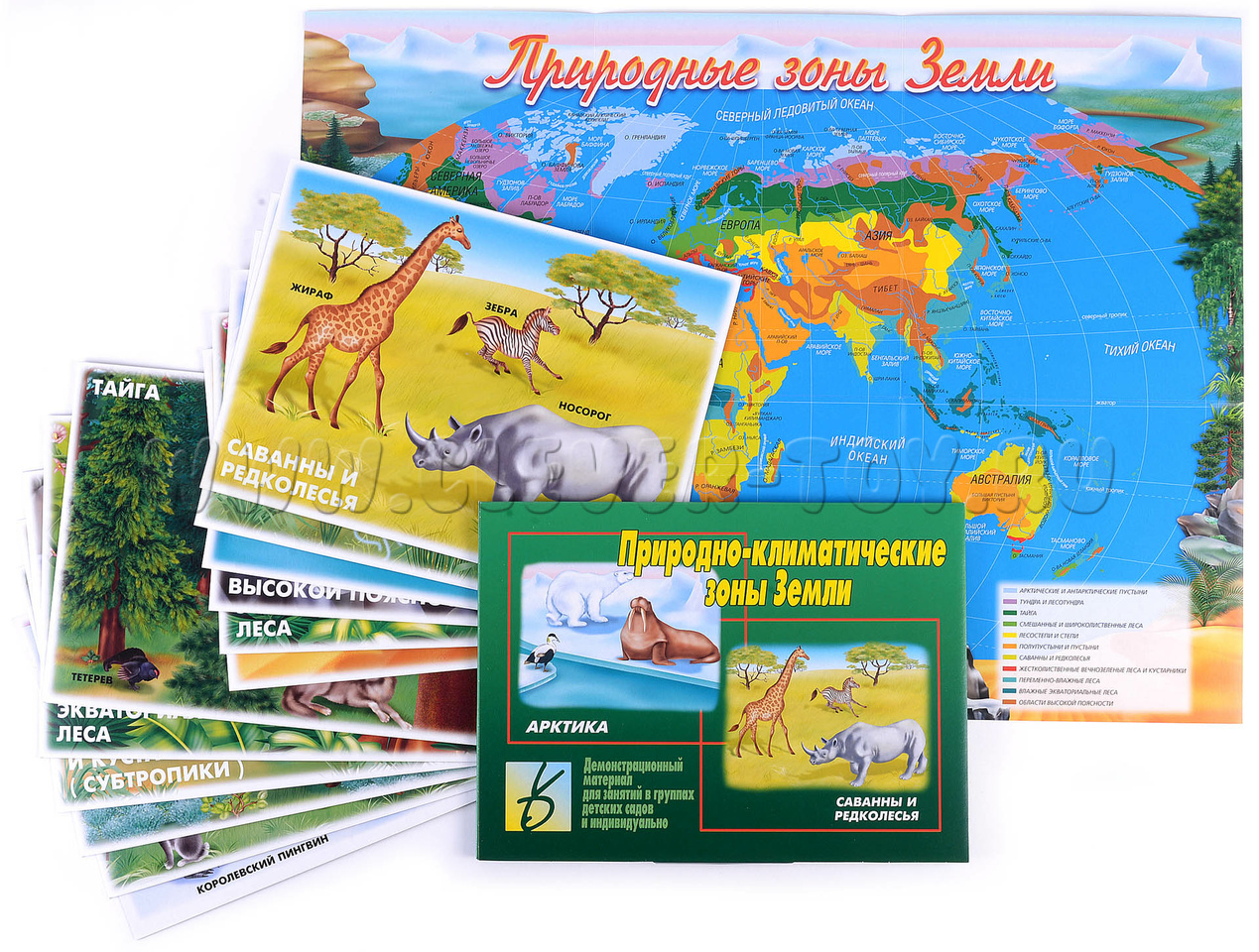 Предлагаем демонстрационный материал, знакомящий детей с природно-климатическими зонами на нашей планете. На картинках изображены обитатели этих зон и среда обитания, климат, в котором они проживают. Познавательная игра подходит для занятий в группах детского сада, а также индивидуально.