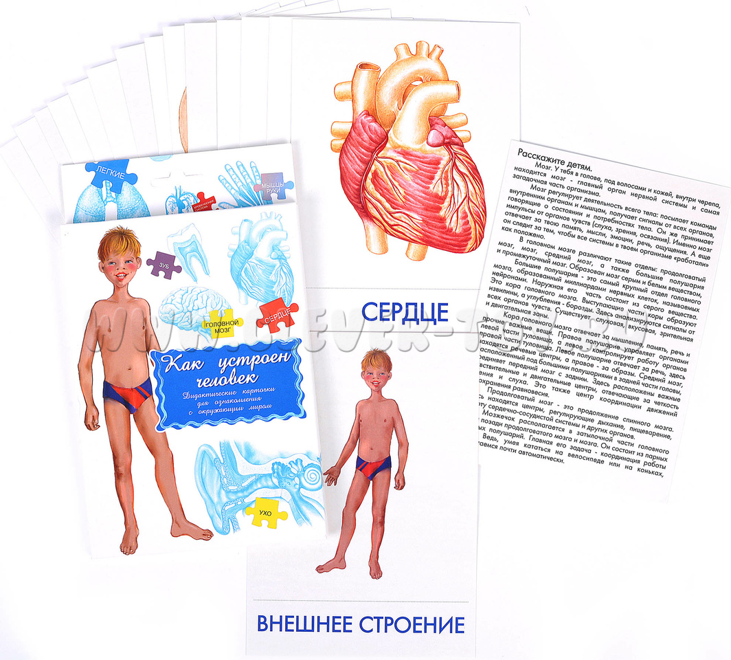 Игра поможет познакомиться со строением человеческого тела, с его системами и органами, а также с интересными фактами про них. Развивающие карточки могут использоваться не только в домашних условиях, но и в дошкольных и школьных учреждениях. Как индивидуально, так и в группе. Игра научит классифицировать, сравнивать и обобщать, а также поможет развить речь. Пособие доставит вашему малышу и вам немало приятных минут проведенных вместе за полезным занятием!