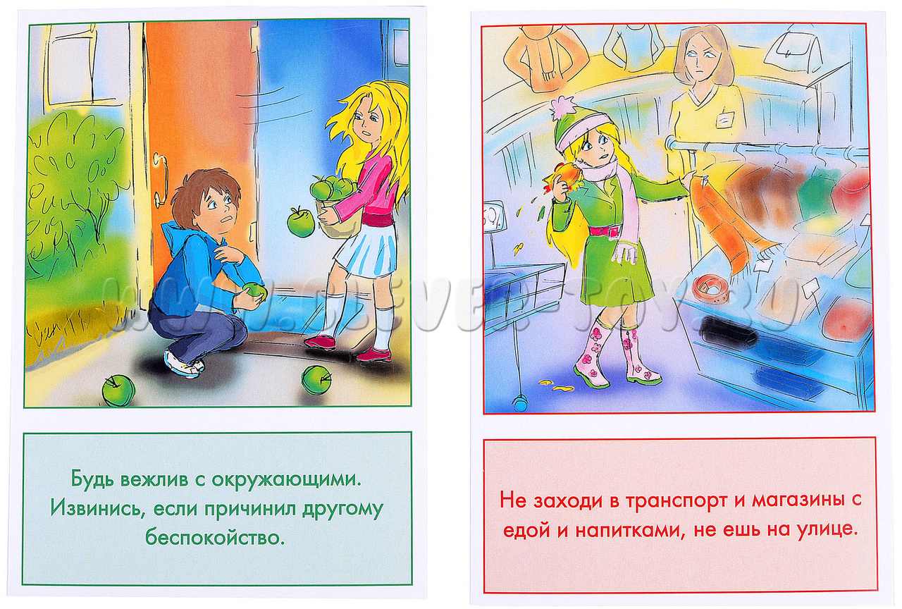 В ходе работы с материалами педагогу или родителю следует ориентироваться на цвет (красный, зеленый) карточки и задавать ребенку наводящие вопросы, уточнять, что сам малыш думает о той или иной ситуации, попадал ли он в нее, становился ли свидетелем. Важно акцентировать внимание ребенка на взаимосвязи между соблюдением правил поведения и доброжелательным отношением окружающих.