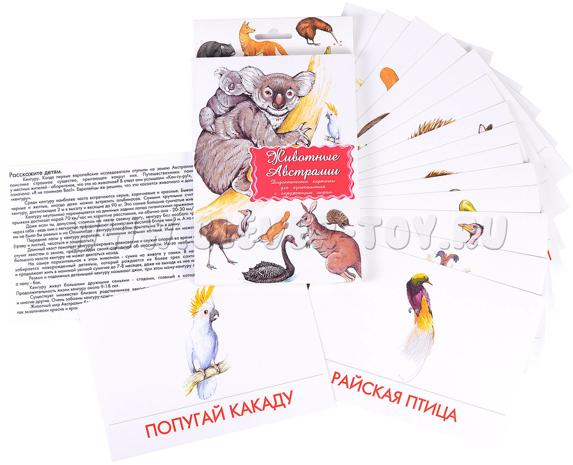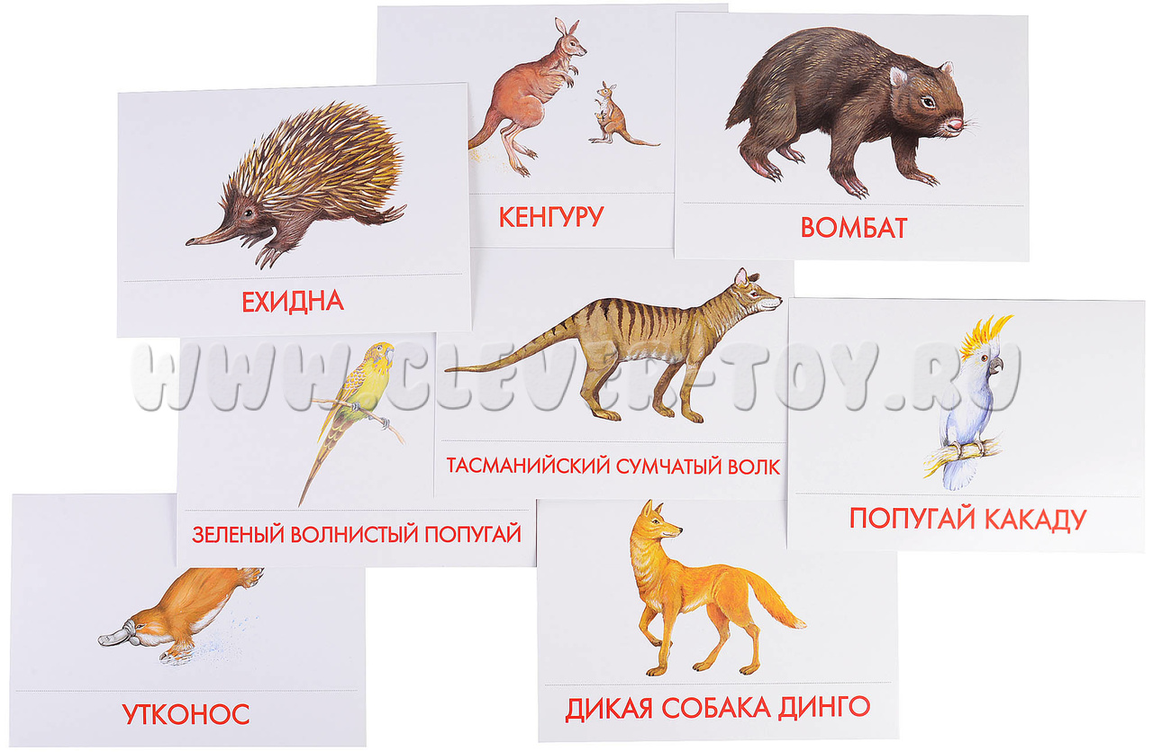 На одной стороне карточки расположена яркая картинка с изображением и названием животного Австралии (изображение детальное и реалистичное), на обратной стороне – доступная для ребёнка информация животных и птицах (описывает внешний вид животного, ареал обитания, особенности питания и строения, интересные факты о происхождении животных Австралии). Карточки выполнены из прочного картона, подходят для многократного использования. За одно занятие рекомендуется изучать одну карточку.