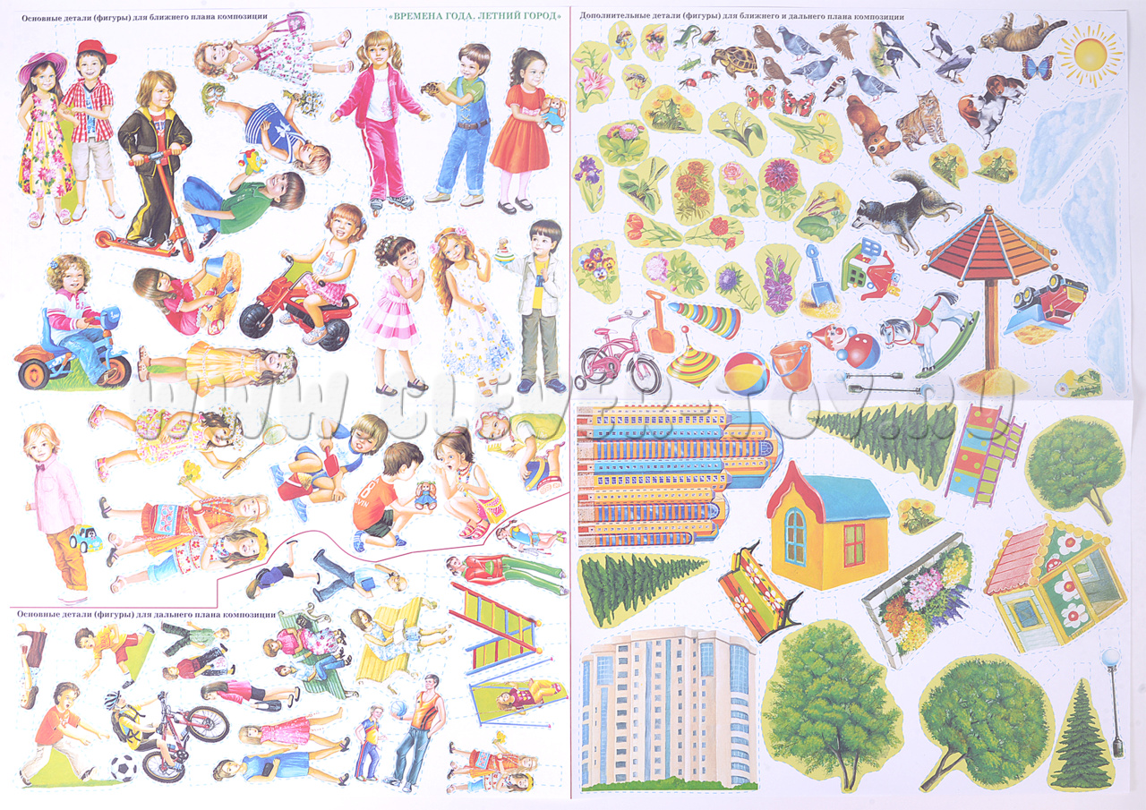 - плакат (А1) с изображением основных и дополнительных фигурок (100-150 штук) для вырезания и наклеивания на сюжетную картину;