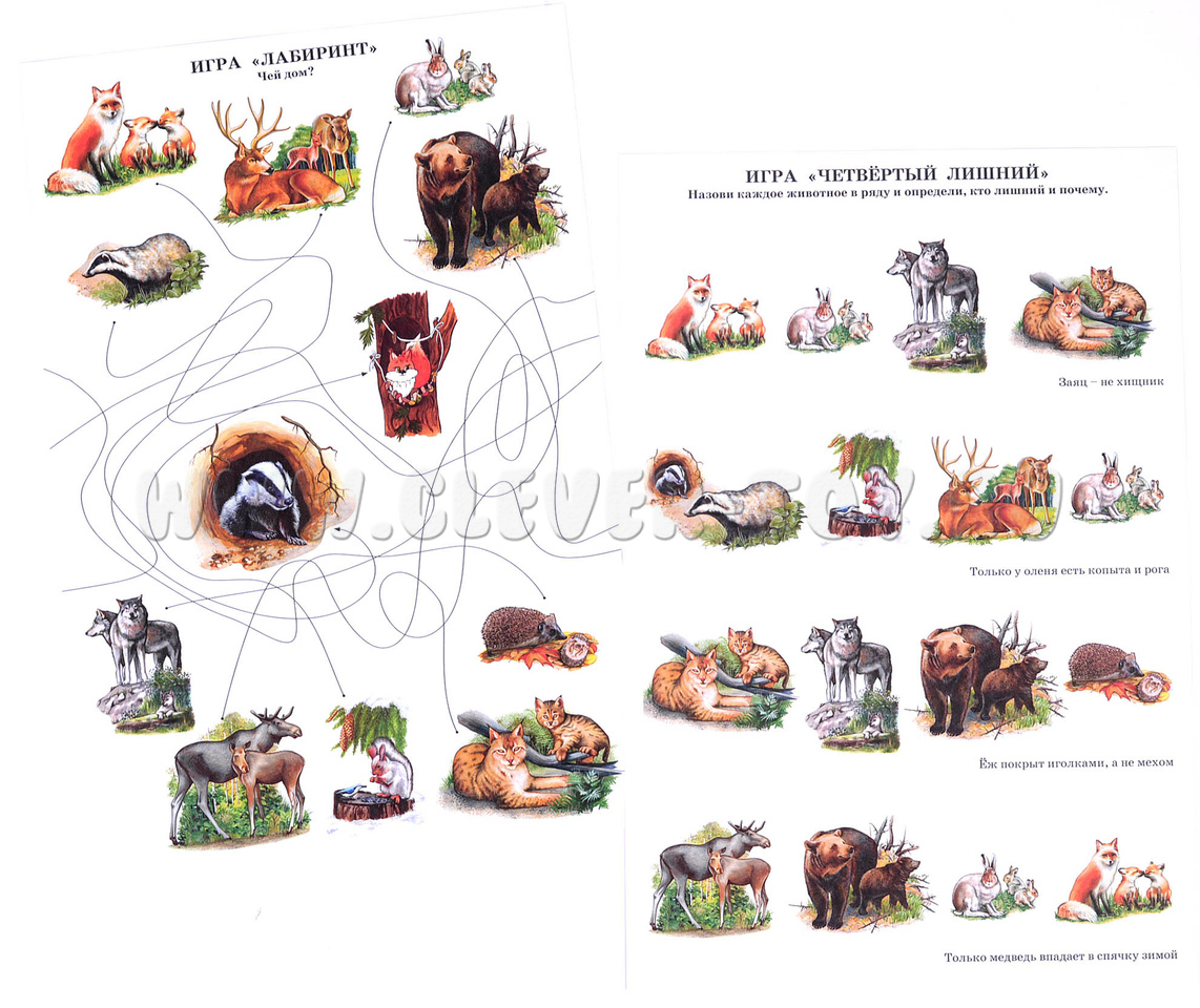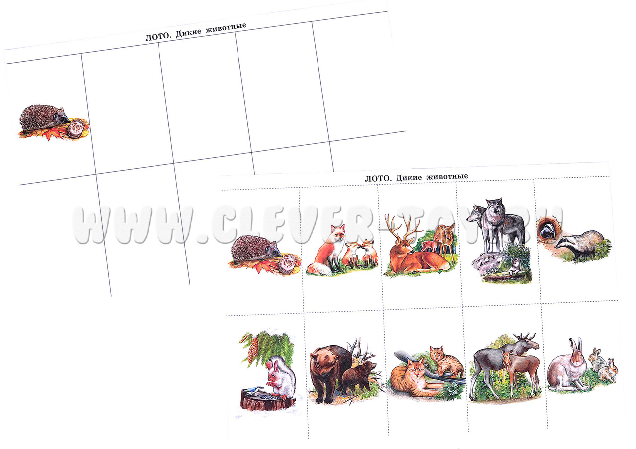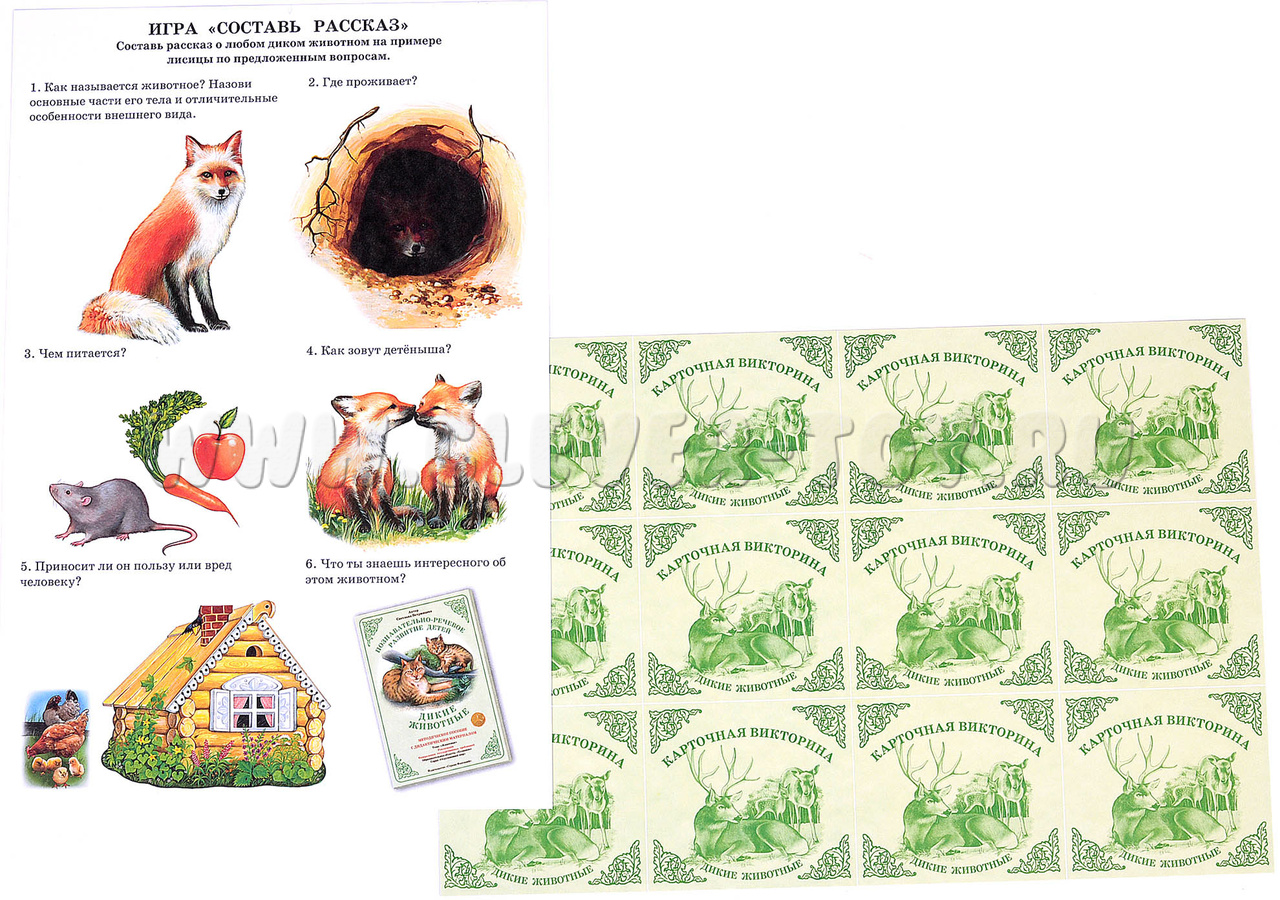 - 10 натуралистичных изображений диких животных (Ёж, бурый медведь, лось, волк, заяц, белка, олень, лиса, рысь, барсук), на обратной стороне - их описание, ареал обитания, особенности поведения, питания, образа жизни;
