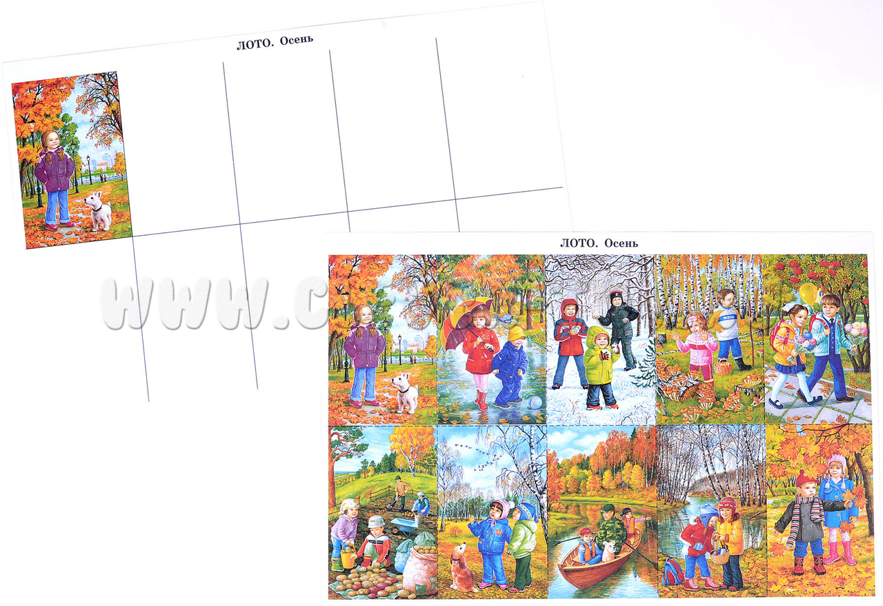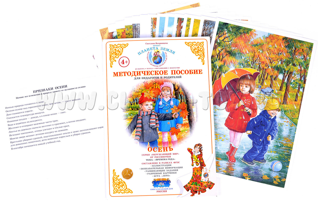 - 10 красочных изображений, иллюстрирующих изменение погоды, явления природы, виды деятельности, на обороте - список признаков осени, пословицы и приметы, загадки, планы развивающих и подвижных игр;