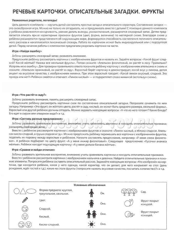 Комплект "Речевые карточки. Описательные загадки. Фрукты" представляет собой 12 листов, состоящих из 35 карточек и 4 игр.