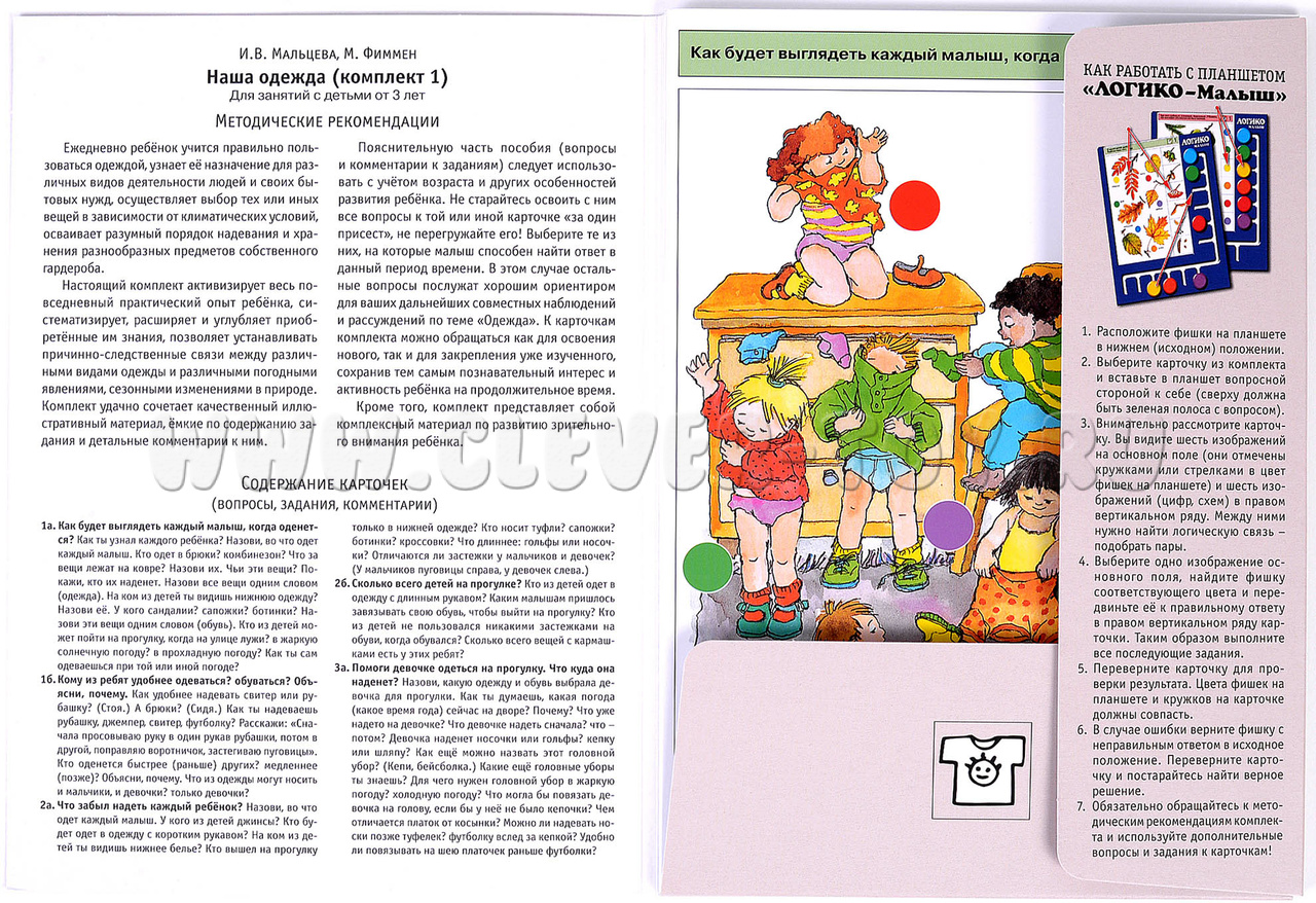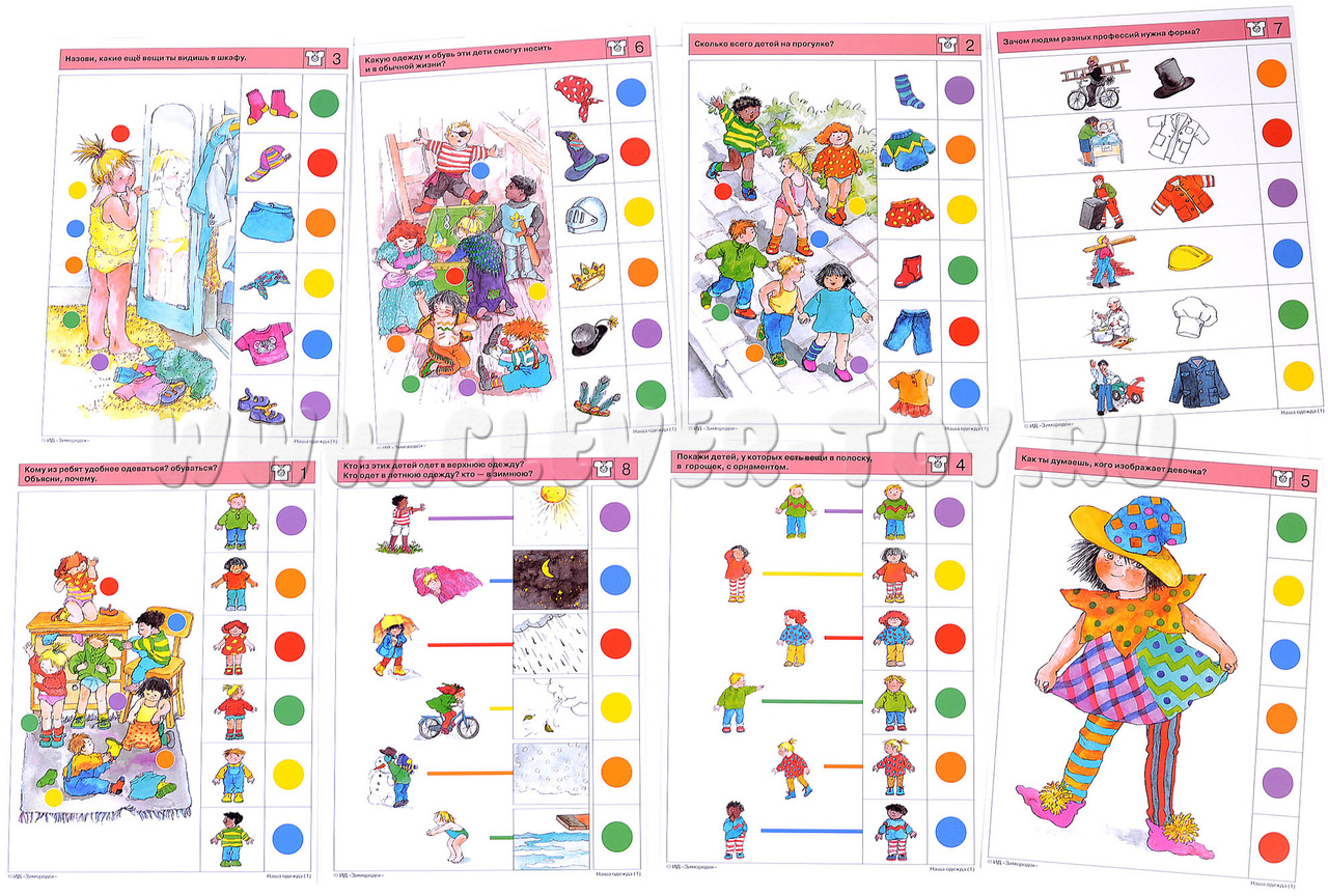 Ежедневно ребёнок учится правильно пользоваться одеждой, узнает её назначение для различных видов деятельности людей и своих бытовых нужд, осуществляет выбор тех или иных вещей в зависимости от погодных условий, осваивает разумный порядок надевания и хранения разнообразных предметов собственного гардероба. Настоящий комплект активизирует весь повседневный практический опыт ребёнка, систематизирует, расширяет и углубляет приобретённые им знания, позволяет устанавливать причинно-следственные связи между различными видами одежды и различными погодными явлениями, сезонными изменениями в природе. Задания по теме равномерно распределены на два комплекта карточек Одежда (1) и Одежда (2) и не повторяются. Примеры заданий в карточках: 1а. Как будет выглядеть каждый малыш, когда оденется? 2а. Что забыл надеть каждый ребёнок? 3а. Помоги девочке одеться на прогулку. Что куда она наденет? 6а. Какой головной убор выберет каждый герой для своего карнавального костюма? 7а. Людям каких профессий принадлежат эти вещи?